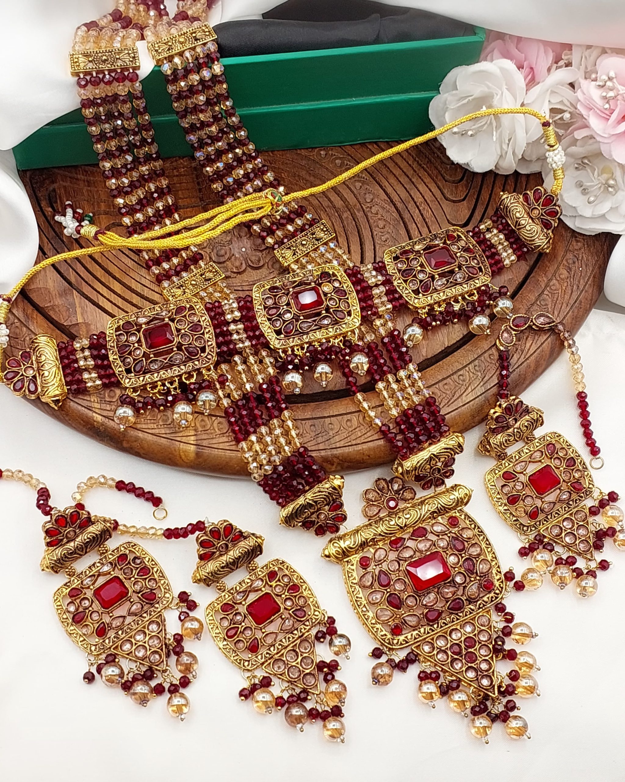 A bridal jewellery set is an exquisite and opulent collection of ornaments designed to complement a bride's wedding attire. It reflects cultural heritage, elegance, and the grandeur of the occasion. Typically crafted with intricate designs and embellishments, bridal sets are made using gold, Kundan, Polki, pearls, American Diamonds, or other precious and semi-precious stones.