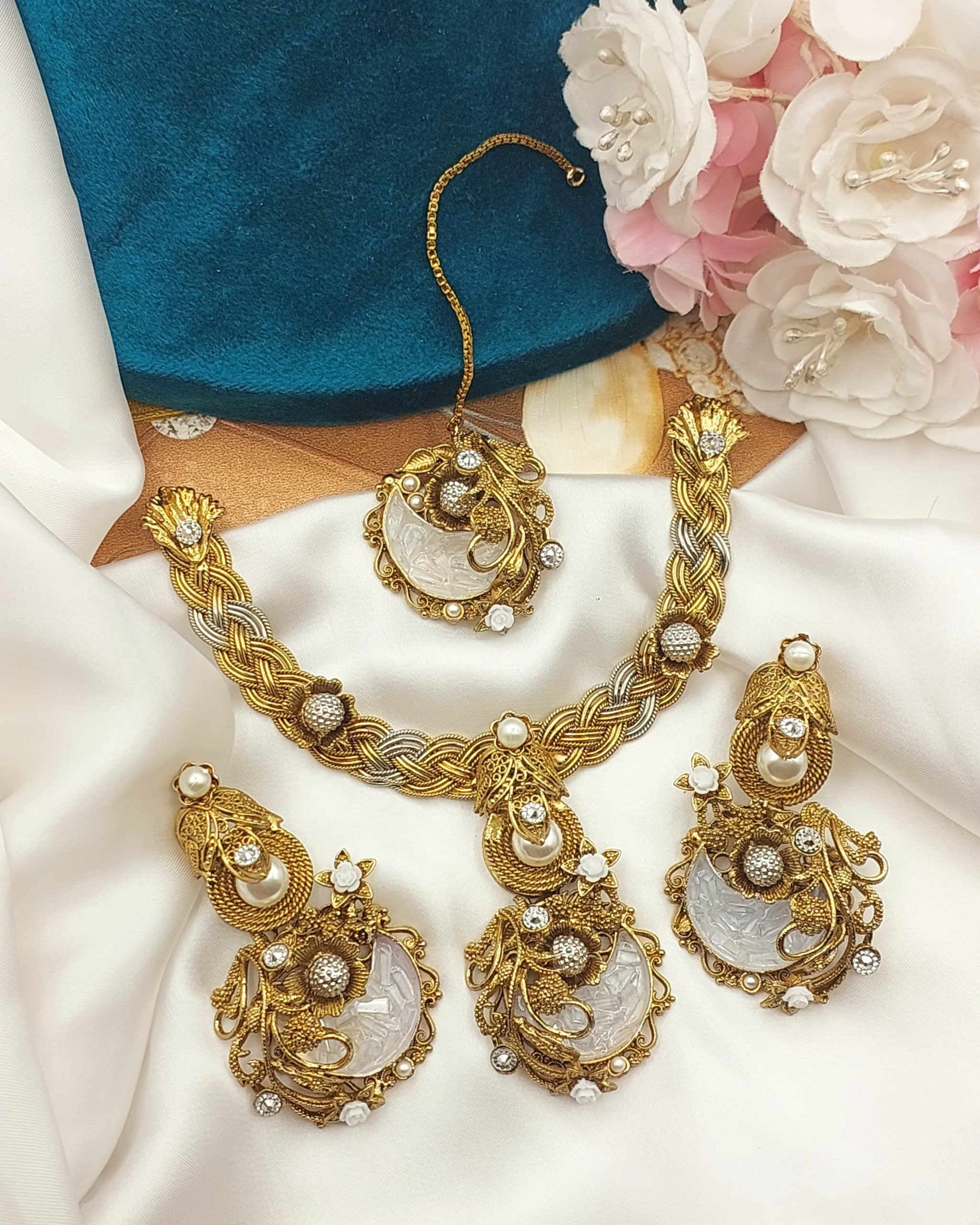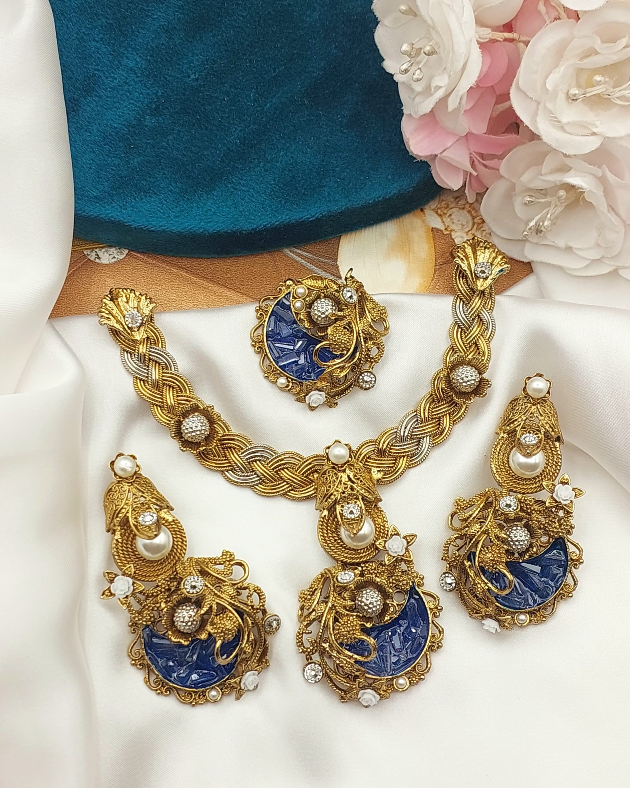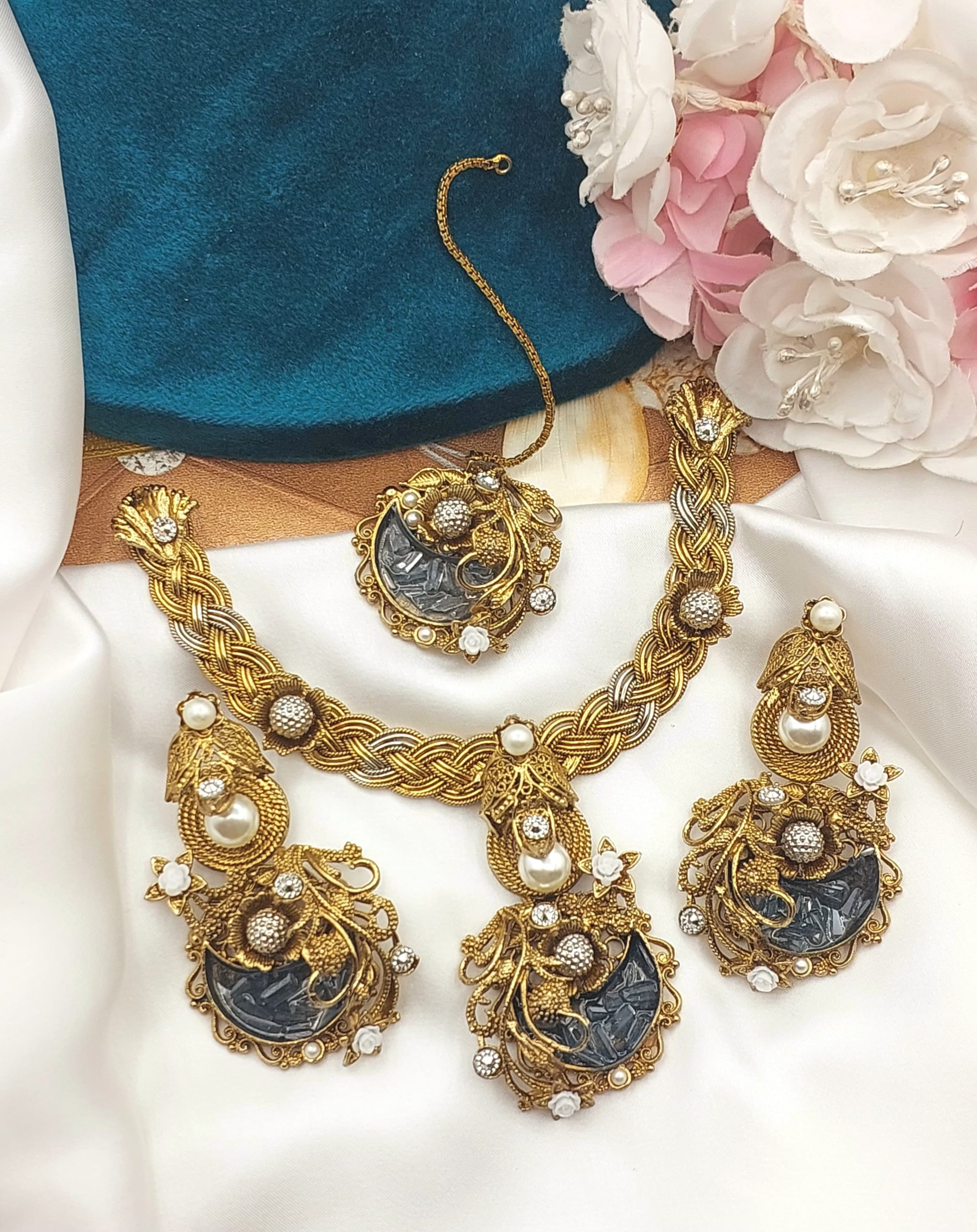 Add a touch of sophistication to your jewelry collection with this stunning necklace set. Expertly crafted with intricate detailing, the set includes a statement necklace paired with matching earrings to complete your look. Perfect for weddings, festive celebrations, or special evenings out, this versatile set blends traditional charm with contemporary elegance. Designed for comfort and style, it's the ideal accessory to enhance both ethnic and modern outfits.