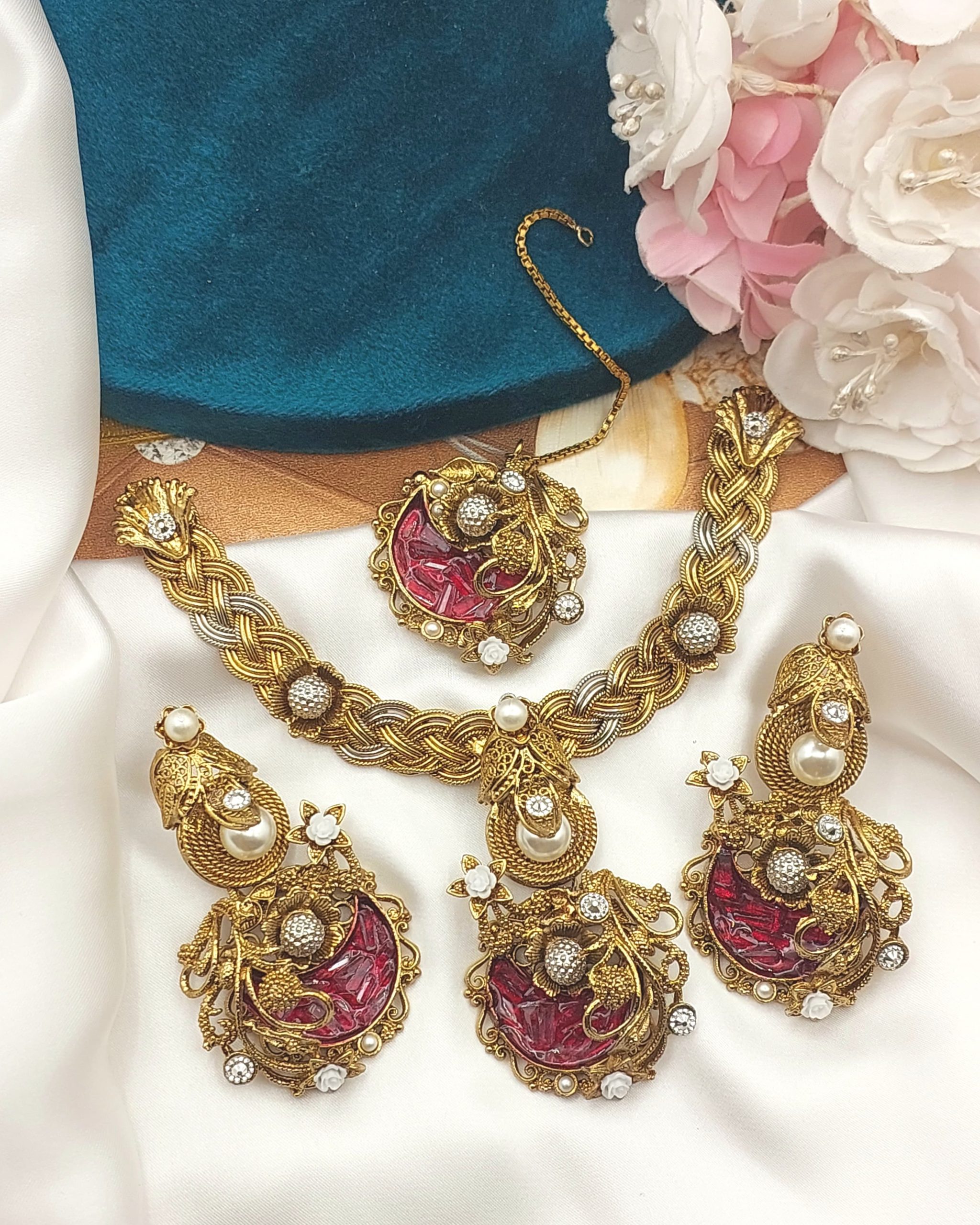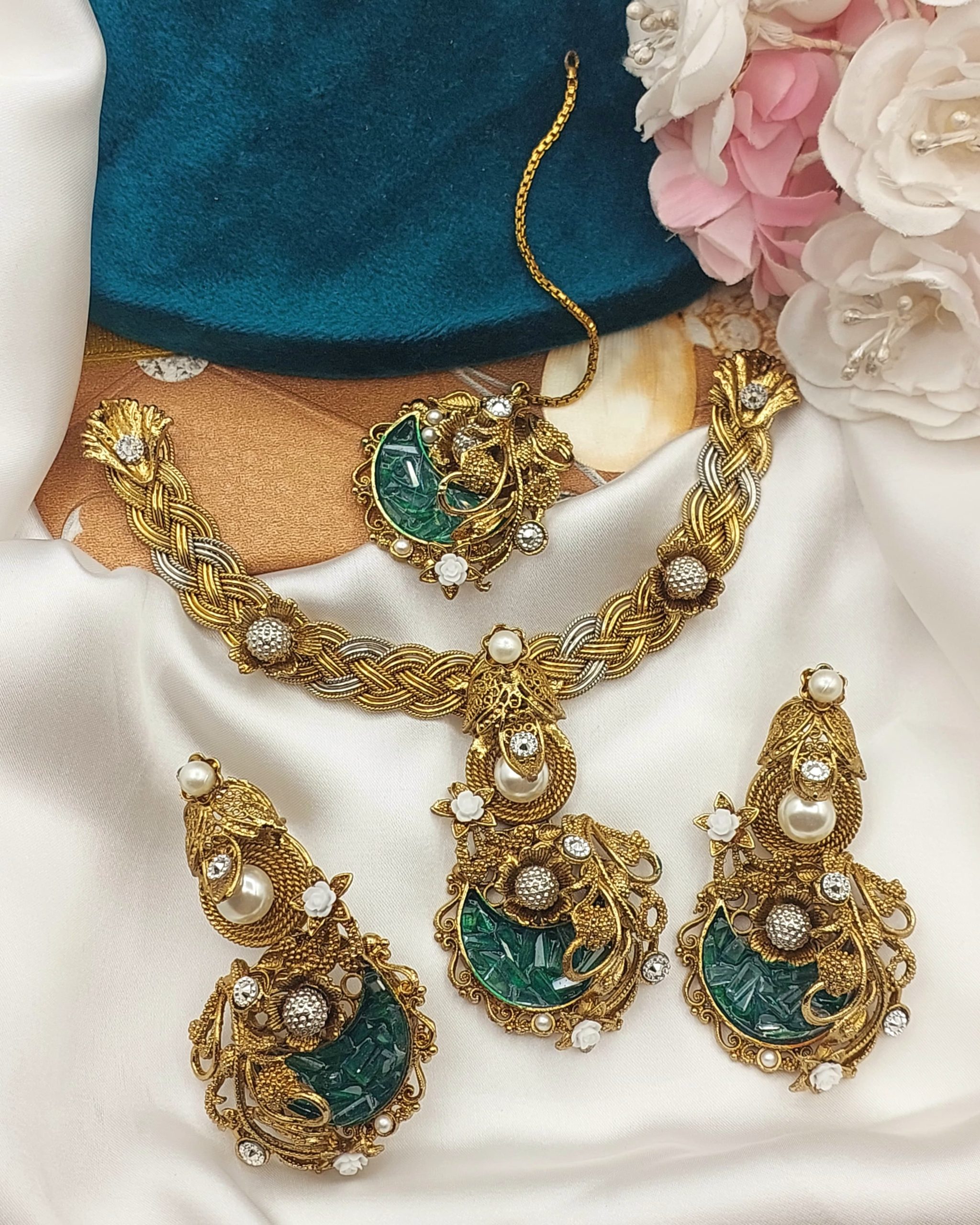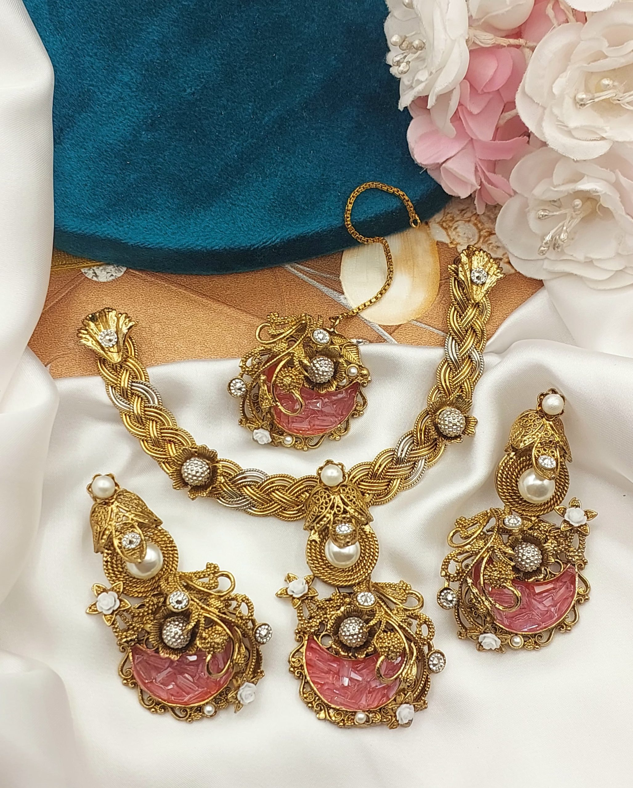 Add a touch of sophistication to your jewelry collection with this stunning necklace set. Expertly crafted with intricate detailing, the set includes a statement necklace paired with matching earrings to complete your look. Perfect for weddings, festive celebrations, or special evenings out, this versatile set blends traditional charm with contemporary elegance. Designed for comfort and style, it's the ideal accessory to enhance both ethnic and modern outfits.