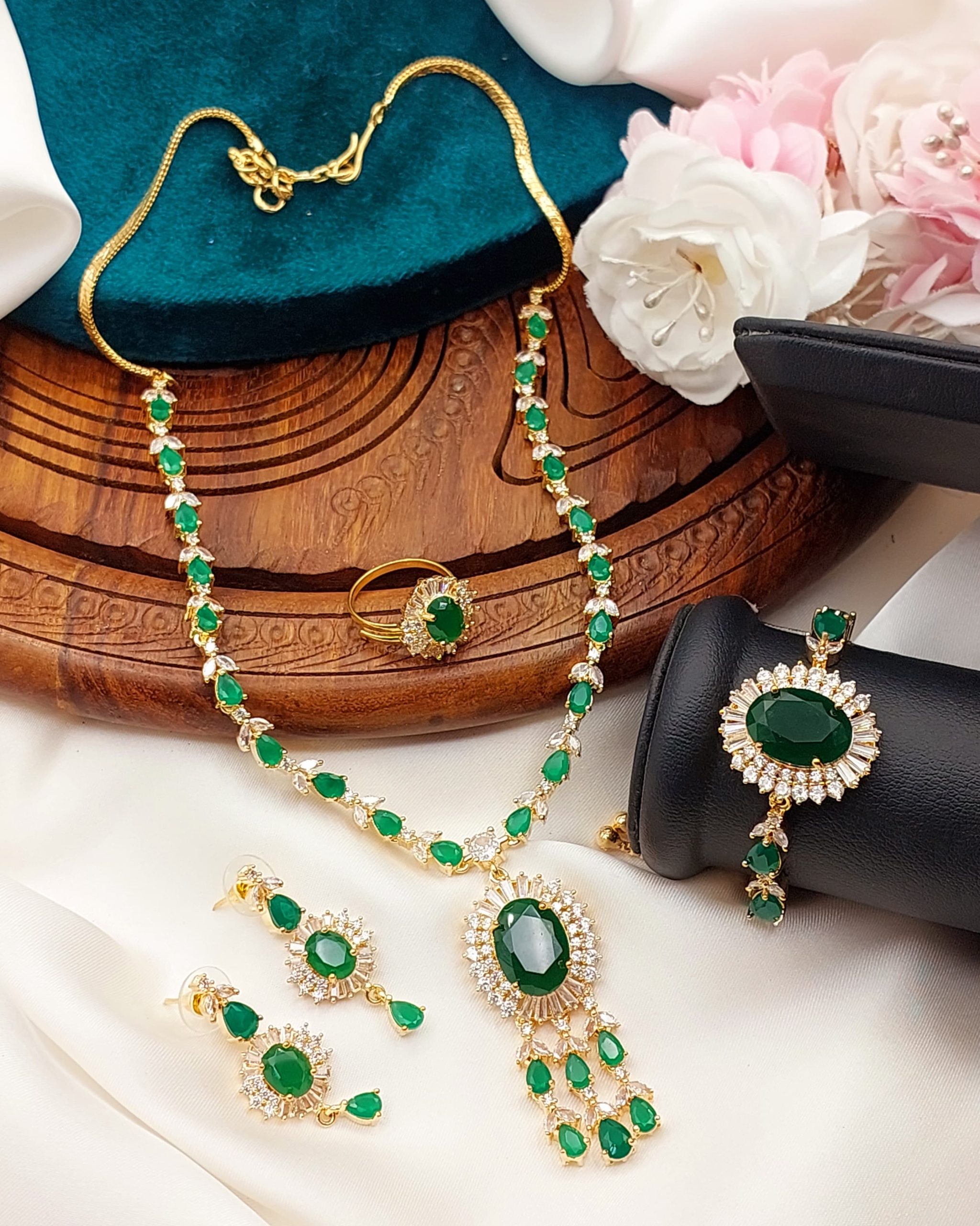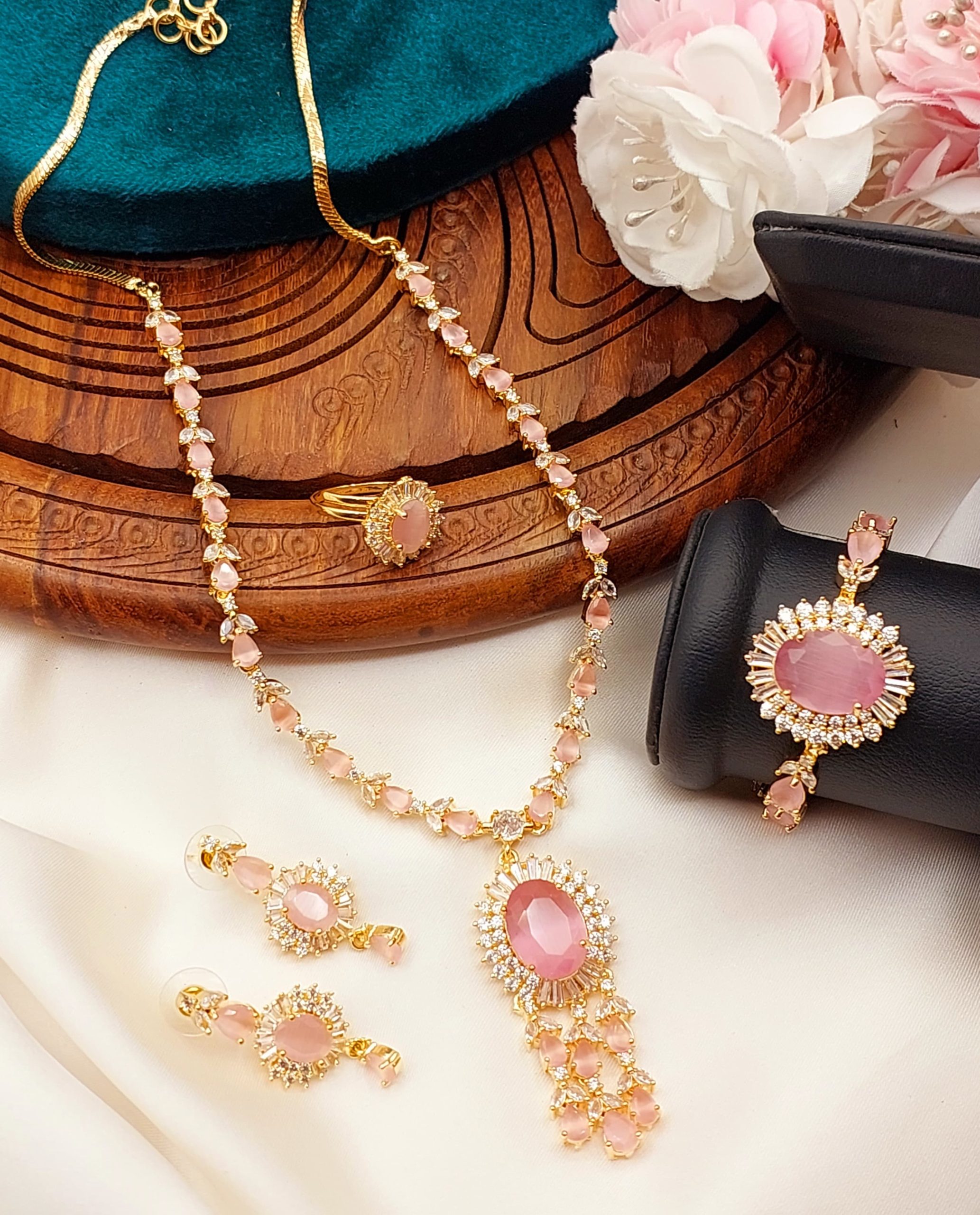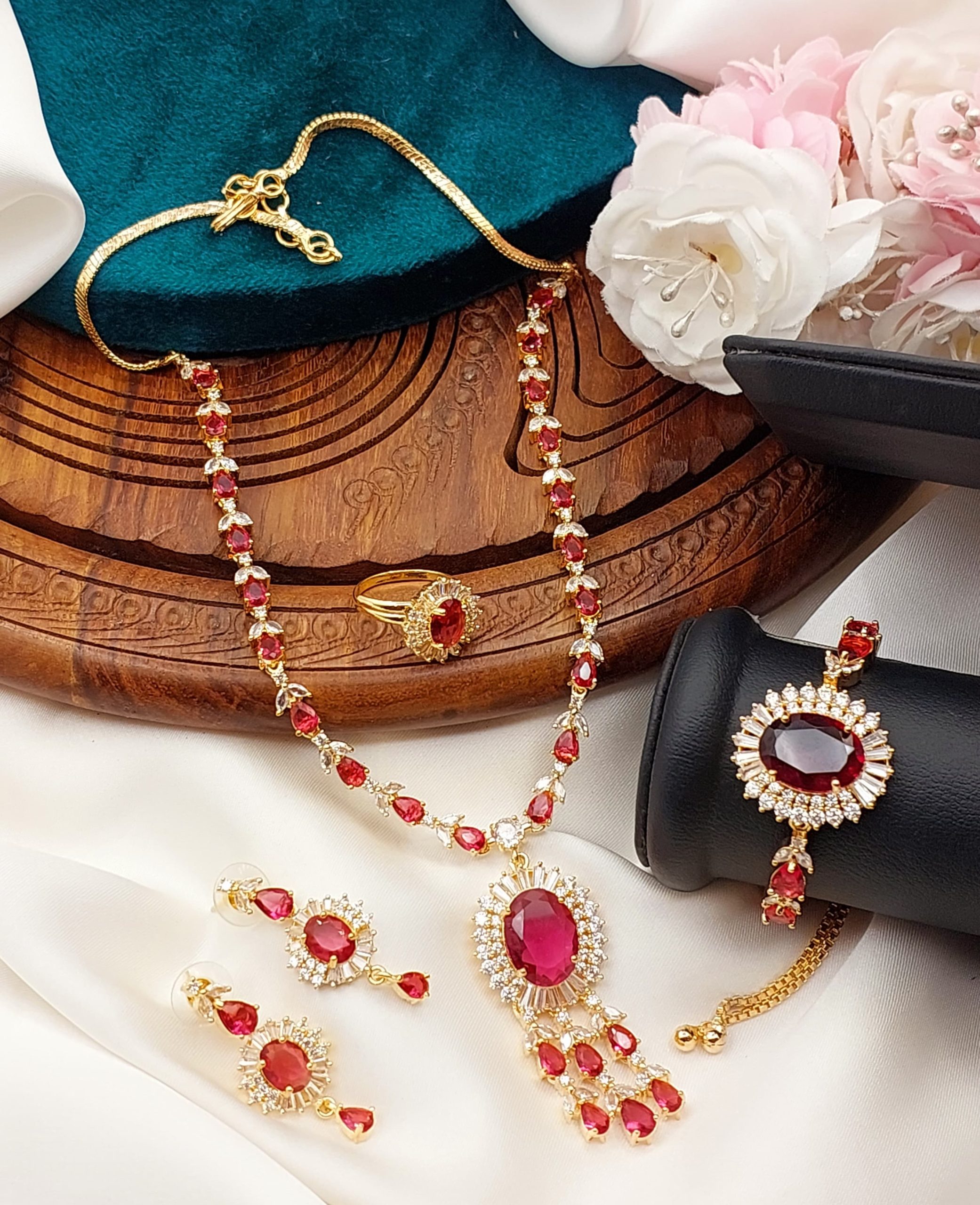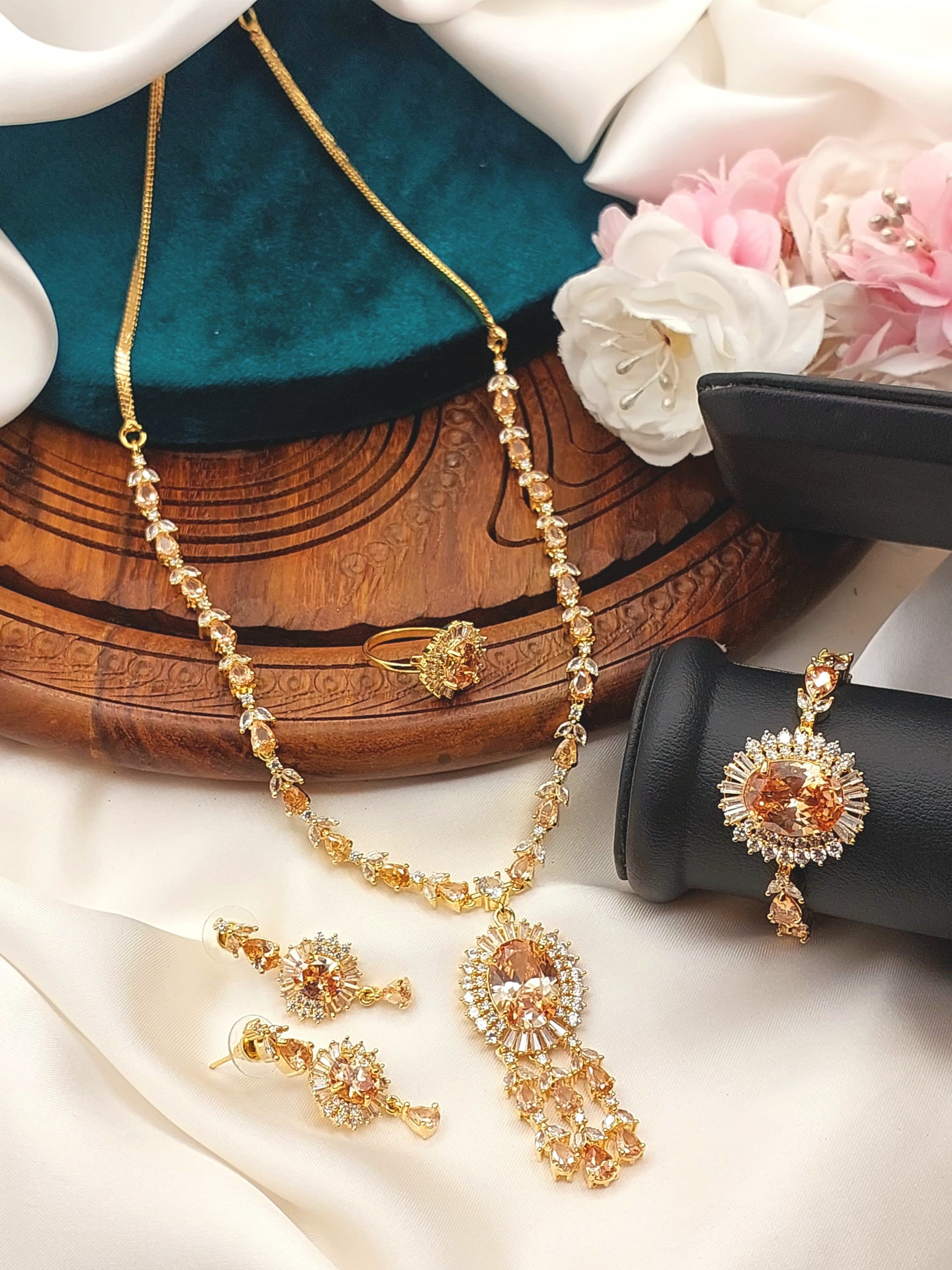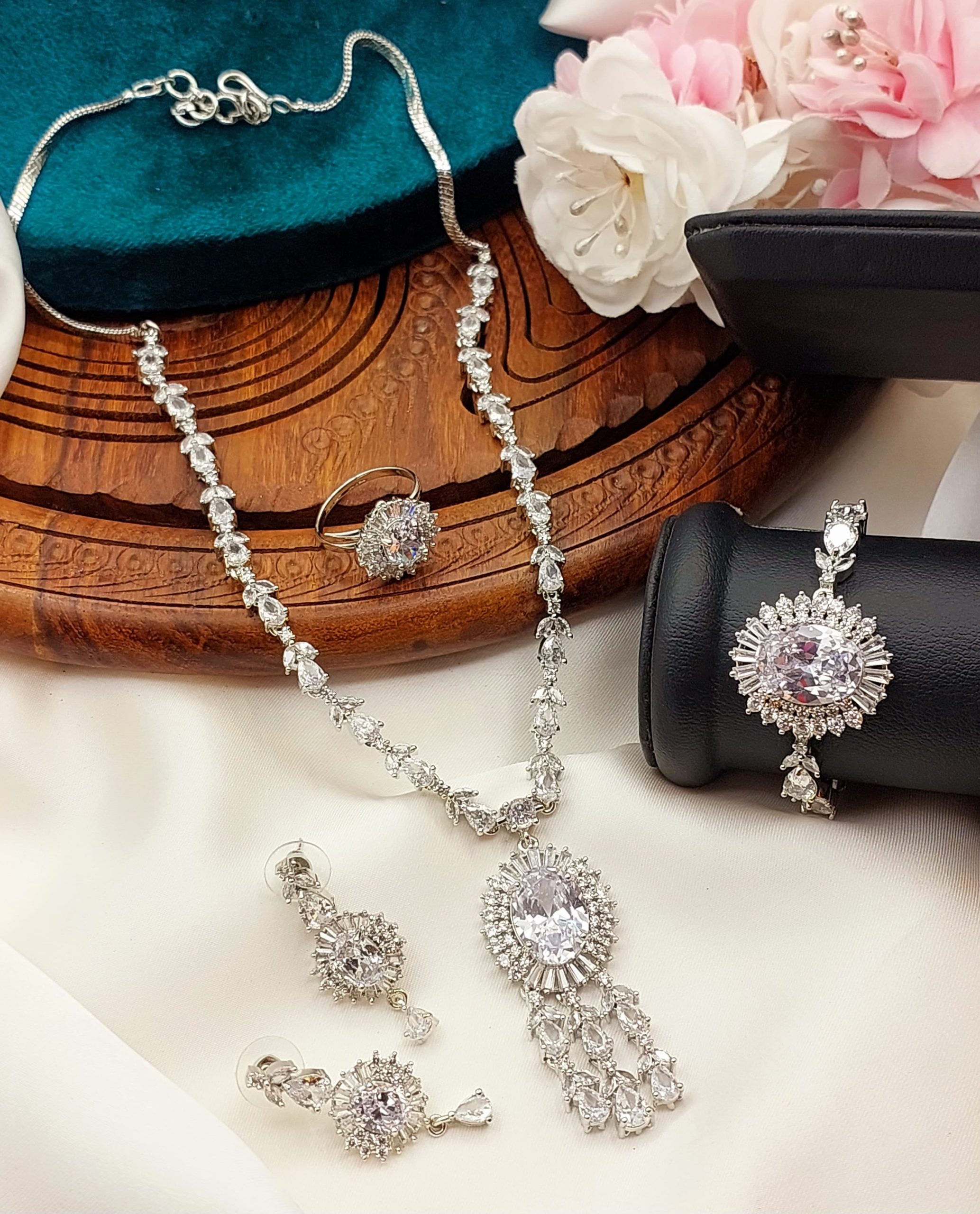 • Material: Base metal (usually copper or alloy) plated with gold, silver, or rose gold. Studded with clear or colored American Diamonds.